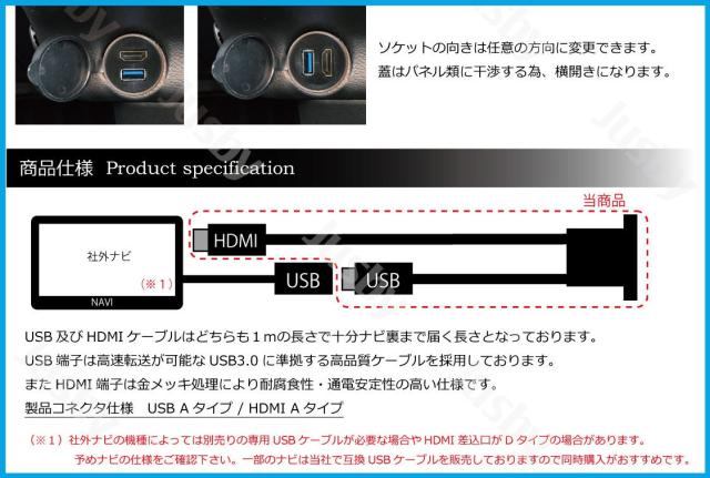 USB・HDMIケーブルはどちらも1mとなっておりナビまで余裕を持って届く長さとなっております。