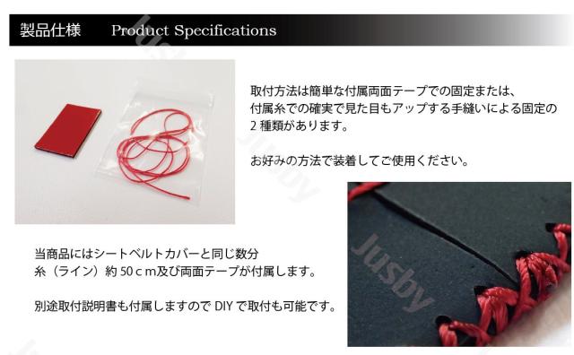 | ・車種専用本皮シートベルトカバー 2個 ・両面テープ 2個 ・糸(約50cm) 2本 ・説明書 |
