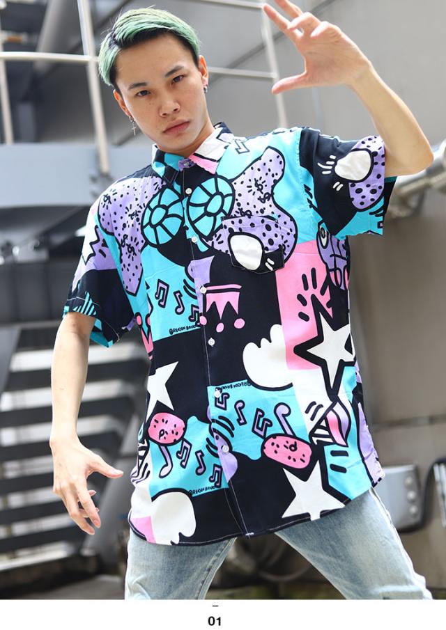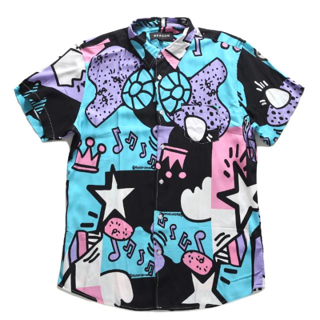 ラスト1点【40%OFF】REASON 半袖シャツ メンズ レディース 春夏用 黒 大きいサイズ リーズン シャツ 半袖 柄シャツ アロハシャツ おしゃれ 総柄 グラフィティ アニメ 漫画 アメコミ 切り替え b系 ヒップホップ ファッション ストリート系 ハイ ブランド 服U1-164