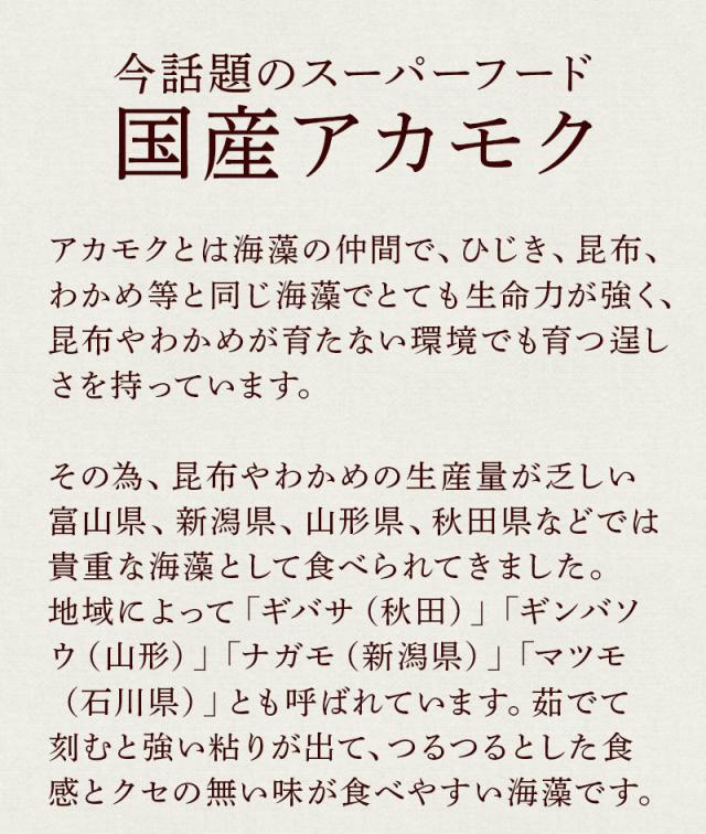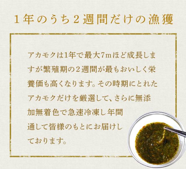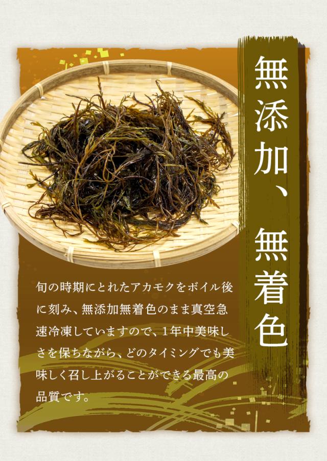 そんなアカモクを旬の時期に採取し、ボイル後に刻んでから無添加無着色のまま真空急速冷凍しているので、一年中美味しさを保ちながらお召し上がりいただけます。