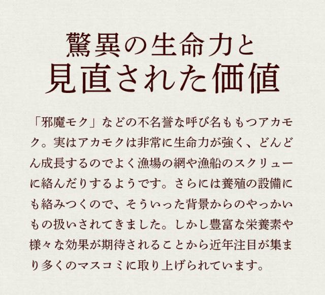 アカモクとはひじき、昆布、わかめと同じ海藻の仲間で、とても生命力が強く、昆布やわかめが育たない環境でも育つたくましさをもっています。