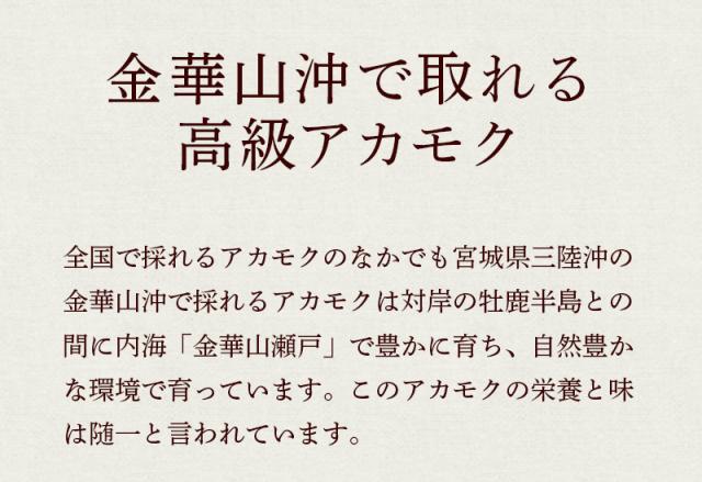 全国でアカモクのなかでも宮城県三陸沖の金華山沖で採れるものは、対岸の牡鹿半島との間にある内海の金華山瀬戸で豊かに育ち、栄養と味は随一といわれています。