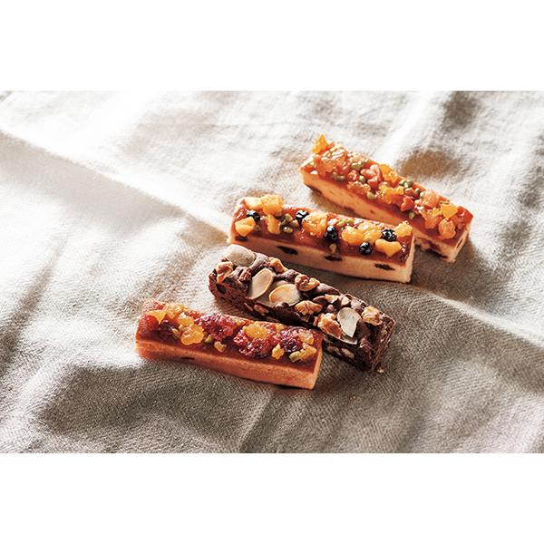ドライフルーツやナッツがしっとり生地の上でおいしい共演ドライフルーツと香ばしいナッツをたっぷり使用。しっとり生地にやさしい甘さと濃厚な風味の香りがぎゅっと凝縮。見た目にも華やかな4種類のスティック型のケーキです。