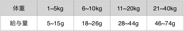 上記の給与量を目安に愛犬の大きさ、健康状態、年齢、運動量などを考慮して1日2回から3回に分けてお与え下さい