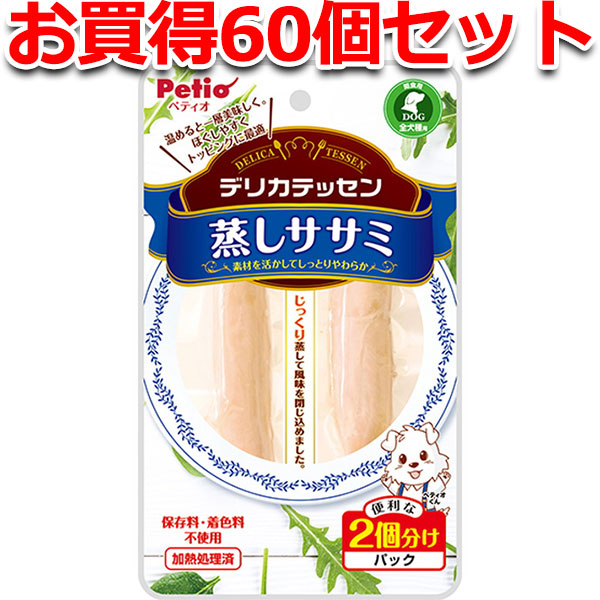 60個セット1個分無料|ペティオ デリカテッセン 蒸しササミ 2本入 鶏 犬用おやつ ササミソフト 鶏 レトルト イヌ 6ヶ月〜 温めると一層美味しく ほぐしやすくトッピングに最適 じっくり蒸して風味を閉じ込めました Petio