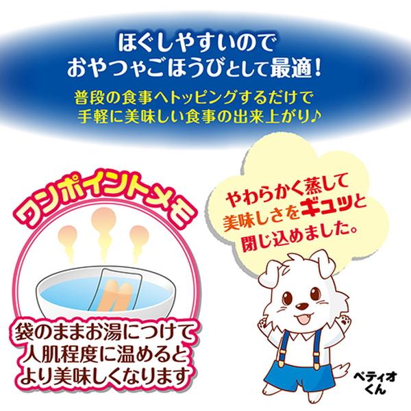 じっくり蒸して風味を閉じ込めました。普段の食事へトッピングするだけで手軽に美味しい食事の出来上がり♪袋のままお湯につけて人肌程度に温めるとより美味しくなります。ほぐしやすいのでおやつやごほうびとして最適!着色料不使用。着色料 不使用