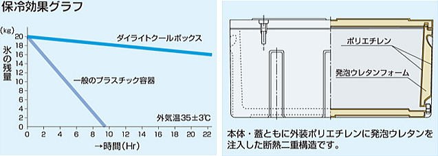 | ・保冷効果と耐久性が抜群です(外装ポリエチレンに発泡ウレタンを注入した断熱二重構造) | |