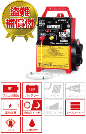 | 付属品 | ゲッターアルカリ電池12V(1個) バッテリーコード(1本) アース棒30型(1本) 注意表示板(2枚) 取扱説明書(1冊) 保証書/登録カード(1枚) | |