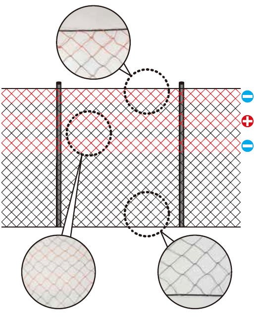 | サルネットには電気が流れる電極部(赤色)が複数編みこんであり、プラス・マイナスを分ける事で 地面から離れたサルに電気ショックを与える事が出来ます。これによりネットによじ登ったサルに 電気ショックを与え撃退する事が出来ます。 サルネットは3段式(サル用)と6段式(サル・シカ・イノシシ等)を用意しております。 |