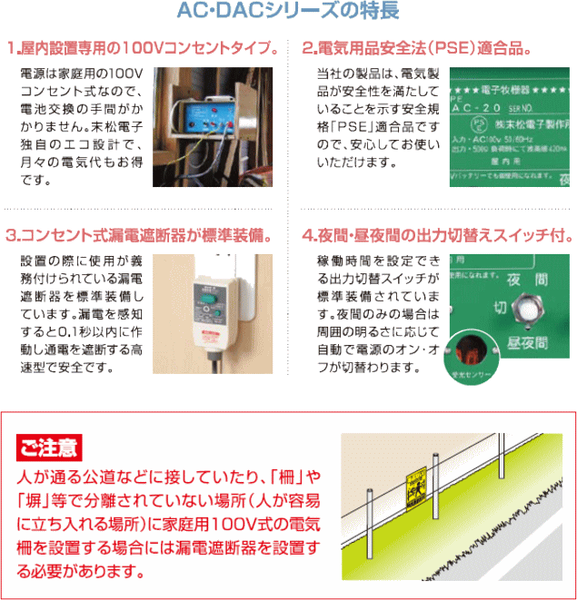 電気柵本器 末松電子製作所 家庭用100V式 AC-20 家庭用電源100Vで電池切れを心配せず使える 屋内設置用 最大電線長 2500m 選べる出力パタン(連続、夜) [送料無料]