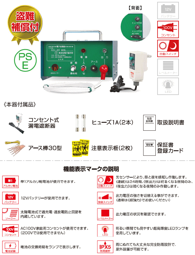 | 付属品 | ・コンセント式漏電遮断器 ・アース棒30型 ・ヒューズ1A ・注意表示板(2枚) ・取扱説明書/保証書登録カード | |
