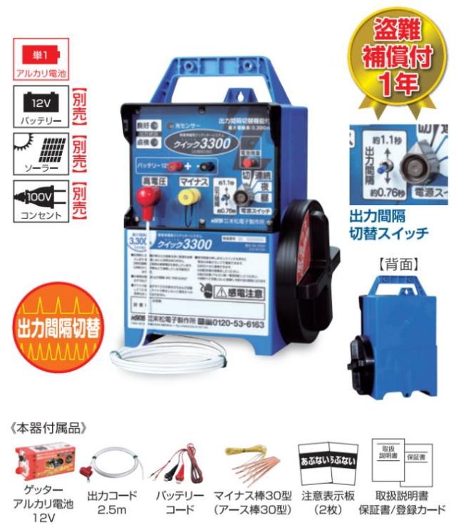 [特売] 電気柵本器 末松電子製作所 クイック3300 Qik-3300 最大電線長さ 3300m 対象動物によって出力間隔切替え可能 屋外用防雨設計 選べる出力パタン(連続、夜、昼) [送料無料]