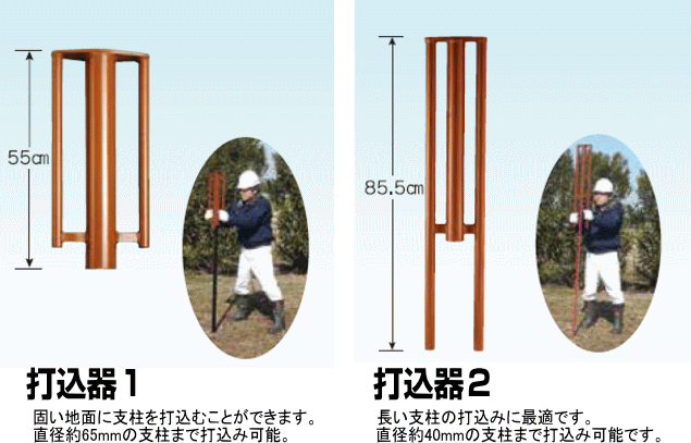 | 長い支柱の打込みに最適です。 直径約40mmの支柱まで打込み可能です。 | ||