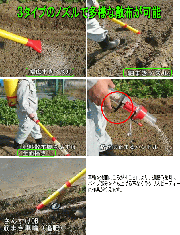 | ■特長■ ●化成肥料、硫安、油粕、棉実粕等のあらゆる粒状 肥料の散布が行えます。 ●全面散布ノズル、巾広まきノズル、細まきノズルなど 用途に応じて付属部品が取り替えられます。 ●車輪を地面にころがすと、追肥作業時などパイプを 持ち上げることなくラクに作業が行えます。 ※OA-24とOB-24の違いについて ・OA-24:ノズルに車輪が付属されません ・OB-24:ノズルに車輪が付属されています。 |
