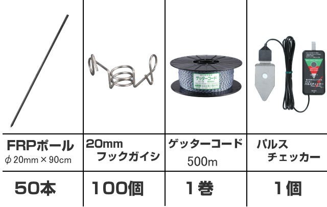 | ※上記仕様の場合、柵線は300m〜400m必要となりますが、今後のメンテナンス等を考慮し 500mのゲッターコードをセットしました。 | |