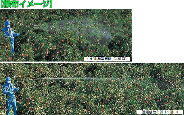 | ・カーボンパイプの採用により、軽量化することで作業負担を軽減します。 当社従来品重量比マイナス約10% ・強力キリナシノズルを使用している為、ドリフトを大幅に低減します。 ・強力キリナシノズルは空気混入によって噴霧粒子を大きくし、噴霧粒径に運動量を持たせ二次破砕 (当たって飛び散ること)により葉裏への薬液の固着性を高めます。 ・手元グリップを回すことにより、遠距離用1頭口(到達距離約10m)と中近距離2頭口(到達距離6m) の2種類の噴口を使い分けすることができます。 街路樹や立木、果樹(みかん、リンゴ等)に最適です。 | |