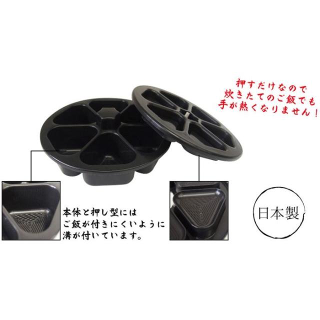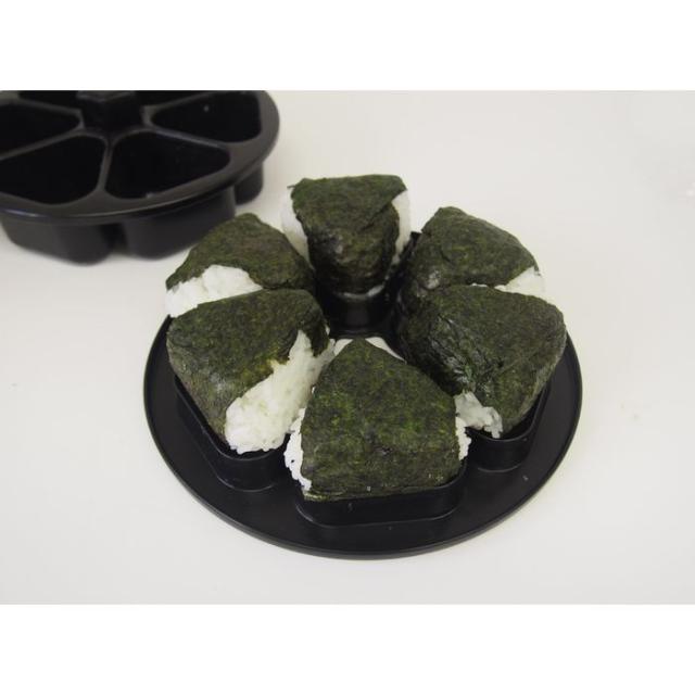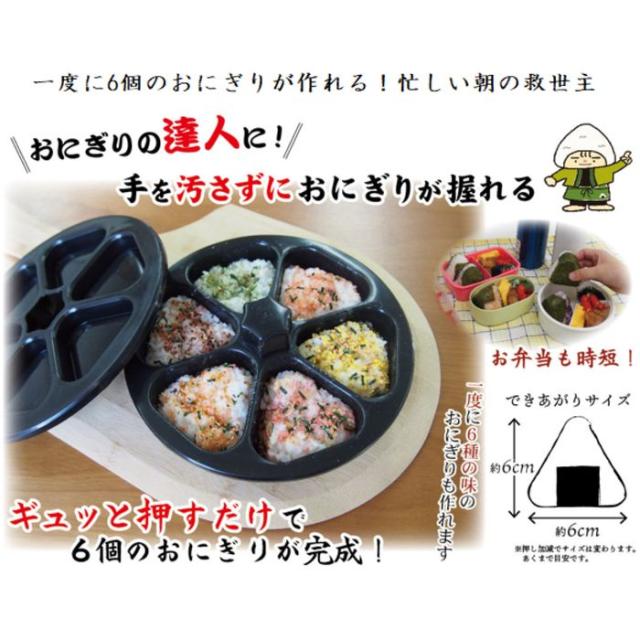 一度に6個のおにぎりが作れる!忙しい朝の救世主。一度に1〜6個のおにぎりが作れます。たくさん作りたい時に大幅時短。本体にご飯を入れてギュッと押すだけ!おにぎりに直接触れずに作れるので衛生的です。誰でも簡単にきれいな形のおにぎりが作れます。海苔をセットして作ると、手を汚さずに海苔巻きおにぎりが作れます。忙しい朝のお弁当作りや、楽しいお出掛けの前に。