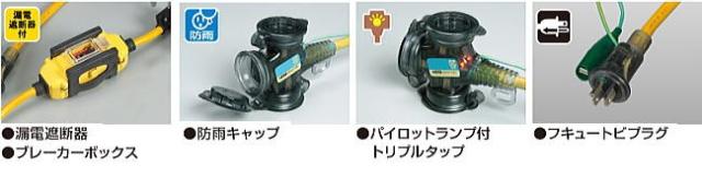 | ●ブレーカーボックス ブレーカーボックスは完全防雨構造なので雨中でも安心して使えます。 落下などの衝撃に強いゴム製プロテクター付。 |