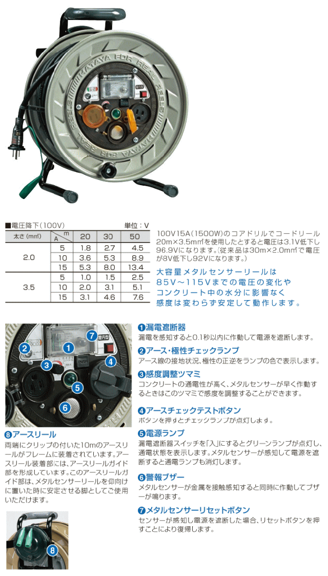 | ●大幅な電圧変化(85V〜115V)の影響を受けることなくメタルセンサー機能が動作。 大型コアドリル等電動工具の使用が可能 |