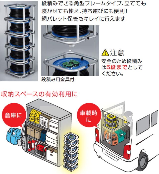 | ●段積みできる角型フレームタイプ ・立てても寝かしても使え、持ち運びにも便利! 網パレット保管もキレイに行えます。 |