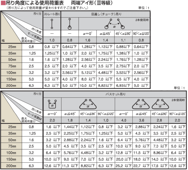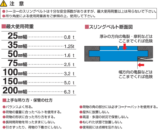 | ●材質は超強力ポリエステル繊維。 ●伸縮性が少なく重量物でも安定した作業ができます。 ●使用限界を知らせる両端の黒いラインまで亀裂や摩耗が生じたら危険信号 ●25mm幅から200mm幅までの7種類 ●長さは1mから50cm間隔。 ●ご希望の長さができます。 ●端数長さでも特注が可能です。 |
