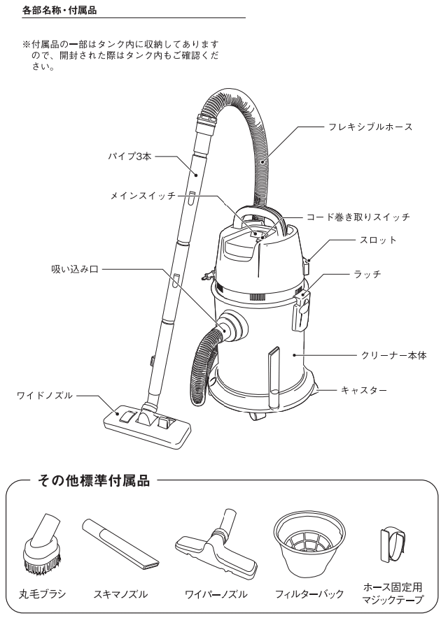 | 仕 様 | ・電源:100V・電流:11A・消費電力:1100W。 ・タンク容量:30L。 ・電源コード長:約5.0m・ホース長:約2m。 ・騒音値:78dB。 ・絶縁方式:二重絶縁構造。 ・サイズ:約365×365×645mm。 ・質量:約7.6kg。 ・最大風量:1.75m3/min・最大真空度:13kPa。 |