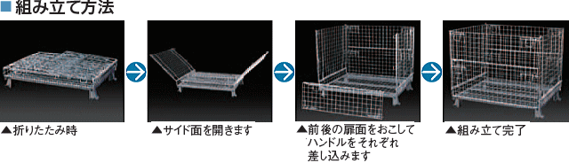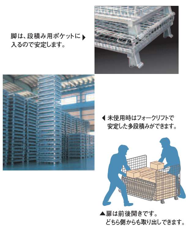 | 軽量ながら強度は抜群。 組立て・折りたたみが簡単で、作業コストを低減。 折りたたんでおけば、保管スペースをとりません。 段積みができ、空間を有効に利用できます。 フォークリフト作業が容易で、作業効率があがります。 | |