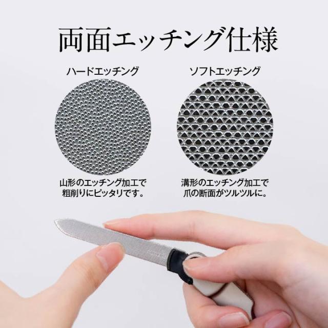 | ■粗さの異なる2種類のエッチングが爪を美しく仕上げる。 真っ直ぐな角度から約20度!力が入りやすく設定した、角度のついたツメヤスリです。 山型のエッチング加工は粗削りに、溝型のエッチングは仕上げにピッタリのツーウェイタイプ。 ■ギフトラッピングが可能です。ご希望の方は、選択肢から「ラッピング有」をお選びください。 ※ギフト包装1つにつき同梱可能な点数は最大1点のみです。 |