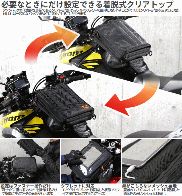 ![]() ライダーの「今」必要な形に変化する。可変システム搭載型タンクバッグ。 タンクバッグの大部分を占めるツーリングマップやタブレットを収納するクリアトップ、そしてバイクへの取り付け に必要なマグネット。これらタンクバッグとして必要不可欠な機能により独特な見た目に仕上がるバイク用のタンク バッグ。そのルックスがゆえ普段使いのバッグとして代用するには癖が強くタンクバッグ用途以外での活躍の場は限 定的です。タンクバッグの要素を備えながらいかにもタンクバッグといった見た目を開放する。様々な環境下でライ ダーがその時に必要とされる形に可変するトランスフォーム・タンクバッグ。 ![]() ![]() ![]() ![]() ![]() ![]() ![]() |