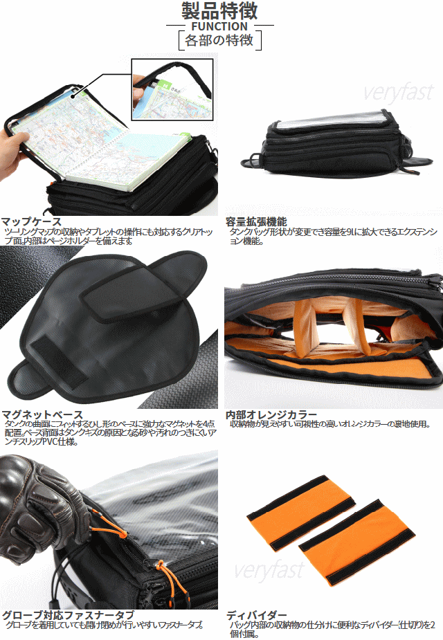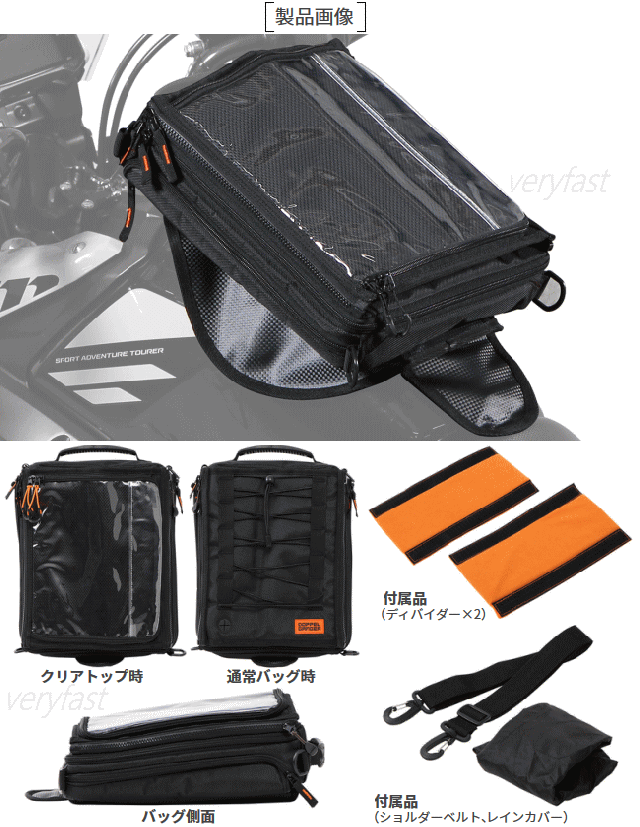 タンクバッグの大部分を占めるツーリングマップやタブレットを収納するクリアトップ、そしてバイクへの取り付けに必要なマグネット。これらタンクバッグとして必要不可欠な機能により独特な見た目に仕上がるバイク用のタンクバッグ。そのルックスがゆえ普段使いのバッグとして代用するには癖が強くタンクバッグ用途以外での活躍の場は限定的です。タンクバッグの要素を備えながらいかにもタンクバッグといった見た目を開放する。様々な環境下でライダーがその時に必要とされる形に可変するトランスフォーム・タンクバッグ。■カラー:ブラック■サイズW25×L(D)32×H10cm(バッグ本体)■製品総重量1kg(付属品含む)■容量6-9L■最大積載重量2kg■材質:ポリエステル■原産国:中国※本製品は防水仕様ではありません。あらかじめ収納物をビニールに入れるなどの防水対策をして下さい。雨天時はレインカバーをご利用下さい。固定用マグネットの磁気によって磁気カード情報の破損や精密機器の故障の恐れがありますので十分にご注意下さい。車体の形状によっては適切に固定できない場合があります。