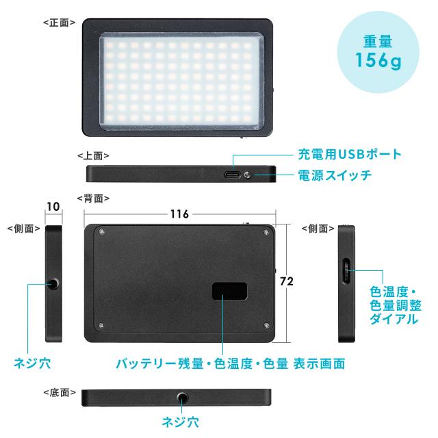 カメラLEDライト ビデオライト 明るさ 色温度調節 USB充電式[200-DG019]
