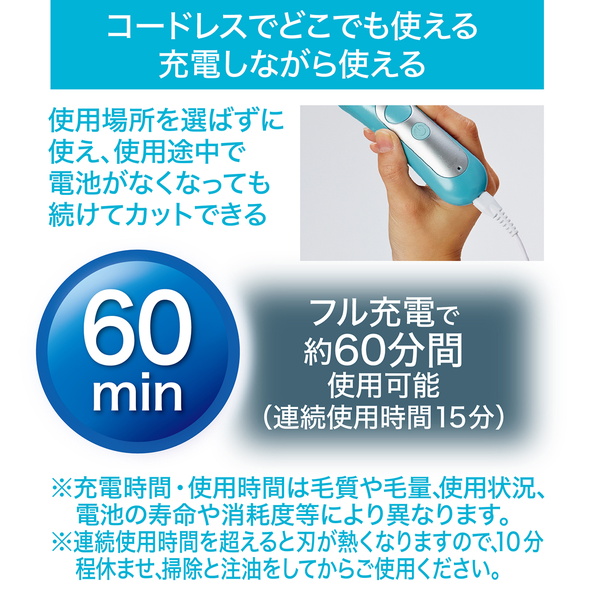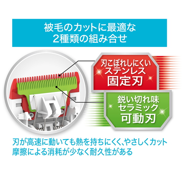 柔らかい毛をキャッチするペット専用刃。被毛のカットに最適なステンレス固定刃・セラミック可動刃の2種類の組合せ|まるごと水洗いOK(IPX6防水相当)。使った後も清潔さが保てる|USB充電式(アダプター・ケーブル付属)。コードレスでどこでも使える。充電しながら使える,専用アダプター・モバイルバッテリーで充電可能。※1000mA出力のものをご使用ください。フル充電で約60分間使用可能。(連絡使用時間15分)|