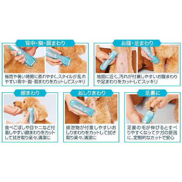 ●カットの合間に毛を取り除き、刃の注油を行う。切味が悪くなった場合は掃除や注油を行う。【被毛をカットしてスッキリ・清潔・安心】<背中・胸・肩まわり>梅雨や暑い時期に蒸れやすく、スタイルが乱れやすい背中・胸・肩まわりをカットしてスッキリ(背中周り)首から背中のラインを水平に保ってカット。(肩・胸周り)首から下へ被毛の流れに沿って。胸部分は複雑なので、少しずつカット。<お腹・足まわり>地面に近く、汚れが付着しやすいお腹まわりや足まわりをカットしてスッキリ(足周り)足の周囲や甲部分は足首に向かってカット。(おなか周り)被毛の流れに沿って角度を変えながらカット。※生殖器や乳首に注意。<顔まわり>食べこぼしや目ヤニなど付着しやすい顔まわりをカットして拭き取り楽々、清潔に(顔・口周り)マズルを固定し、皮フがたるんでる箇所は引っ張って平らにし少しずつカット。※垂れ耳の場合は、両耳に注意。※ヒゲに注意。<おしりまわり>排泄物が付着しやすいおしりまわりをカットして拭き取り楽々、清潔に(尻周り)しっぽを持ち上げ固定し、肛門周りにかかる被毛を中心から外に向かってカット。※肛門に注意。<足裏に>足裏の毛が伸びるとすべりやすくなってケガの原因に、定期的なカットで安心(肉球周り)足首を固定し、肉球中心部を押し指の間を拡げる。肉球にかかる被毛を肉球に沿って少しずつカット。※指の間の水かきを注意。バリカンの使用方法やカットの手順等、詳しい内容は「取扱説明書」に記載しています。