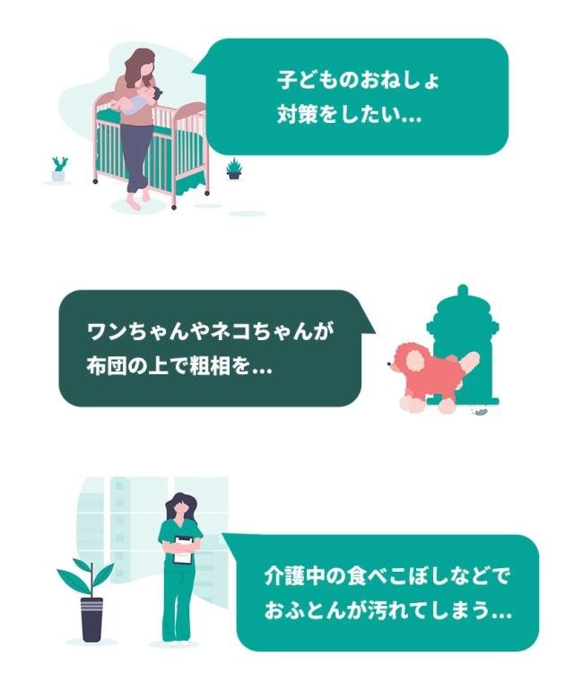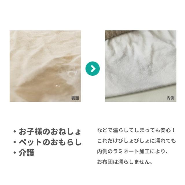 コーティングにより下の布団まで水分が達することが少ないので、洗えないお布団も汚れることなく、お子様のおねしょやペットのおもらし対策、介護などにぴったりです。