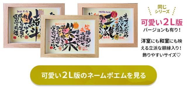 下記ヒアリング事項を注文途中の備考欄にご記入ください。 未記入でも、ご注文後にこちらからヒアリングいたします。 《ヒアリング事項》 1.お入れするお名前(漢字と読み方): 2.贈るお相手の誕生日(もしくは記念日、入籍日): ※作品にお入れする誕生日花になります。 3.お名前の方の性別: 男・女 4.ご用途(出産祝い・お誕生日祝い・結婚祝い・還暦祝い等): 5.贈るお相手とのご関係(友人・恋人・家族等): 6.ポエムに込めたい気持ち、想い: 7.その他 ご要望(日付など): ※文章はこちらで決めますが、ご希望などがあれば最初にご相談ください。 ※デザインで何かご希望があればご相談ください。 ※注意事項 ・製作者お任せとなります。 ・誕生花・花言葉は当方でお調べしてお入れします。 ・配置、色使い等は書家お任せとなります。 ・デザイン書道となりますので、味わいや、手書きのぬくもり、それぞれの個性を尊重するために書き順やとめ、はね、はらいなど通常の書道とは異なる場合があることをご了承ください。 ・ネームポエムに関して、詩の表現や熟語にないも漢字もありますので すべてを使わず漢字一文字や、ひらがなになる場合もございます。 メインの文字をフルネーム表記のご希望でも詩は名前部分からの制作になります。 また2名様の場合は文字数の構成上、詩には漢字一文字づつ(漢字の熟語がない場合はひらがな)とさせていただきます。 ※こちらの商品は下書き確認なしで一気に仕上げるタイプとなります。 |