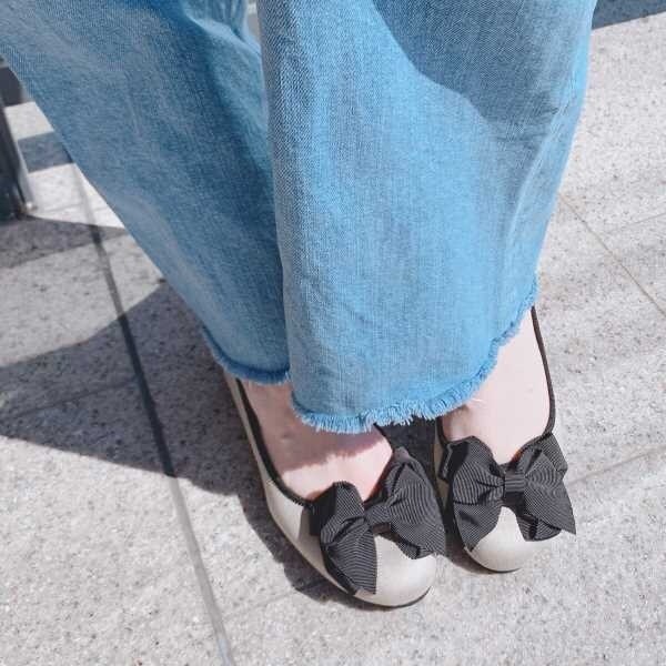 こちらは、大きめで立体感があるリボンが特徴のラウンドトゥフラットシューズになります。女性らしい優しいテイストですが、履き口のテーピングがデザインを引き締めてくれます。