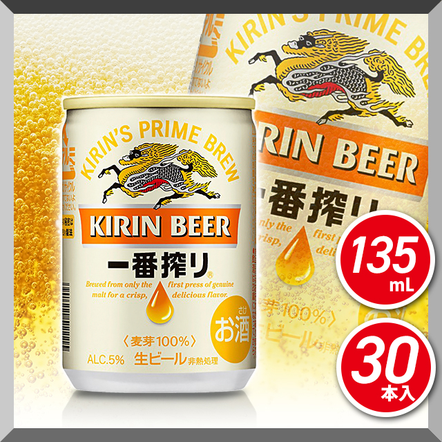 商品名 キリン 一番搾り 生ビール 135mL×30本 容量 135mL×30本 原材料名 麦芽(外国製造又は国内製造(5%未満))、ホップ アレルギー特定原材料 − 生産国 日本 賞味期限 商品の発送時点で、60日以上あるものをお届けいたします 保存方法 常温 アルコール度数 5%