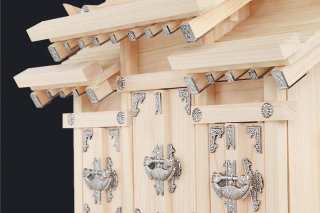 職人による手仕事からうまれる上質な屋根違い三社タイプ。左右のお部屋に入らないお札は、中央のお部屋に重ねてお祀りします。