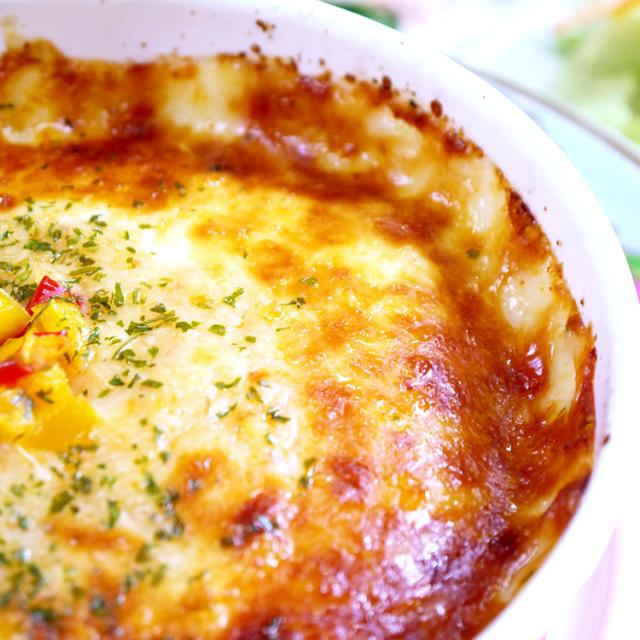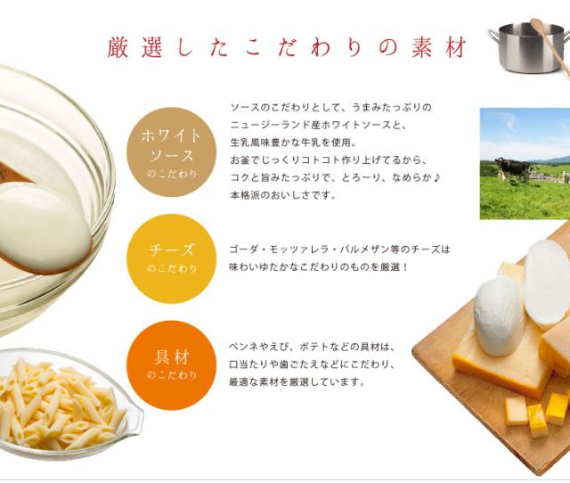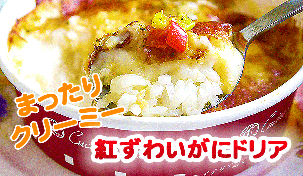 米(国産)、牛乳、チーズ、脱脂濃縮乳、ホワイトソース、かまぼこ、赤ピーマン、食塩、べにずわいがに、オニオンソテー、植物油脂、乳等を主要原料とする食品、パン粉、加工油脂、バター、砂糖、クリーム、かにエキス、油脂加工品、フュメドポワソンベース、チキンエキス、ゼラチン、チーズ加工品、甘味果実、酒、パセリ、チーズ風味パウダー、香辛料、ミルポアペースト/増粘剤(加工でん粉、増粘多糖類)、調味料(アミノ酸等)、pH調整剤、乳化剤、加工でん粉、香料、ソルビトール、着色料(紅麹、カロチノイド)、香辛料抽出物、(一部にかに・小麦・卵・乳成分・大豆・鶏肉・ゼラチンを含む)
