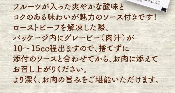 【ローストビーフソース】水飴、醤油、トマトピューレ、醸造酢、ウスターソース、濃縮りんご果汁、乾燥玉ねぎ、ぶどう糖果糖液糖。食物繊維、おろし生姜、おろしにんにく、コショウ粉末、調味料(アミノ酸等)、増粘剤(キサンタン)、酸味料、(原材料の一部に小麦、オレンジ、大豆、りんごを含む)
