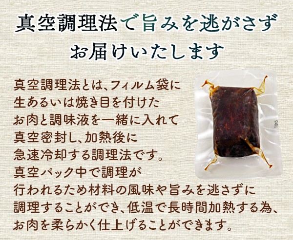 高温の油で表面を焼き上げた後、肉の旨みを逃がさない「真空調理法」による製品です。