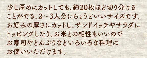 柔らかいのでうす切りスライスだけでなく、サイコロカットや厚切りスライスでも美味しくお召し上がりいただけます。