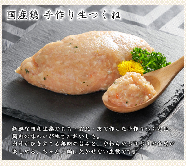 鶏肉(国産)、豚肉(国産)、鍋だし旨塩味[蛋白加水分解物、食塩、にんにく、肉エキス(ポーク、チキン)、構造酢、昆布エキス、米発酵調味料、魚介エキス(かつお、ホタテ)、魚醤、植物油、焼きあご粉末、香辛料、野菜エキス(ネギ)、アジ煮干粉末、調味料(アミノ酸等)、増粘剤(キサンタン)、香料、(原材料の一部に小麦、大豆、鶏、豚を含む)]