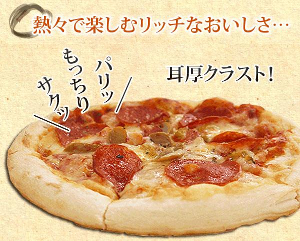 ピザクラスト(小麦粉、ショートニング、砂糖、植物油脂、イースト、食塩)、ナチュラルチーズ、トマトソース、ペパロニソーセージ、マッシュルーム、ベーコン、青ピーマン、ブラックペッパー/酸味料、ガセインNa、リン酸塩(Na)、増粘剤(キサンタンガム)、着色料(パプリカ色素、コチニール)、調味料(アミノ酸)、酸化防止剤(ビタミンC)、発色剤(亜硝酸Na)、香辛料抽出物、(一部に小麦・乳成分・大豆・豚肉を含む)