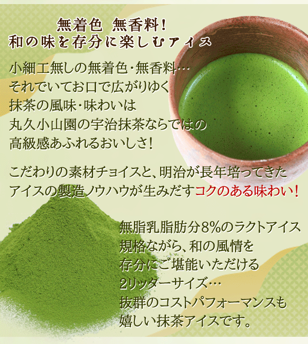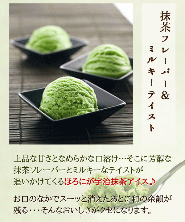 老舗茶舗、京都丸久小山園謹製の宇治抹茶を使ったほろ苦さと端正なコクが、アイスクリームのミルキーな甘味を引き立てる、人気の抹茶アイスです。