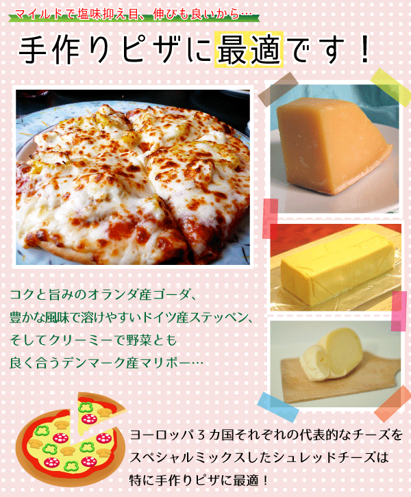 本場のゴーダ・ステッペン・マリボーの特徴を生かしつつ、バランス良く配合したシュレッドタイプ。