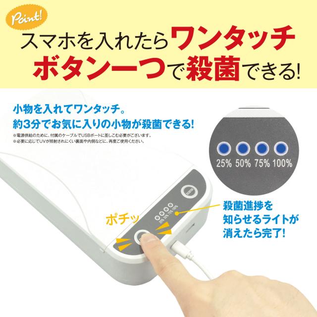 特長1.スマホをいれたらワンタッチボタン1つで殺菌できる。