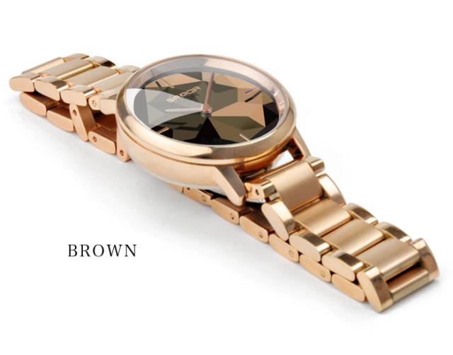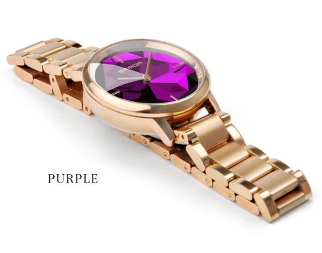 見る角度により表情が変わる。きらびやかな文字盤の腕時計 多面カットを施された文字盤は、文字盤の角度が変わるたびに光の当たり方が変わり、きらきらと光を反射させる、ちょっと不思議でとってもラグジュアリーな腕時計です。 文字盤のカラーもブラックやグレーのシックなカラーから、ブルーやパープルの鮮やかなカラーをご用意しています。 他にはないデザインでとってもカワイイから気になる女性にプレゼントにも最適。