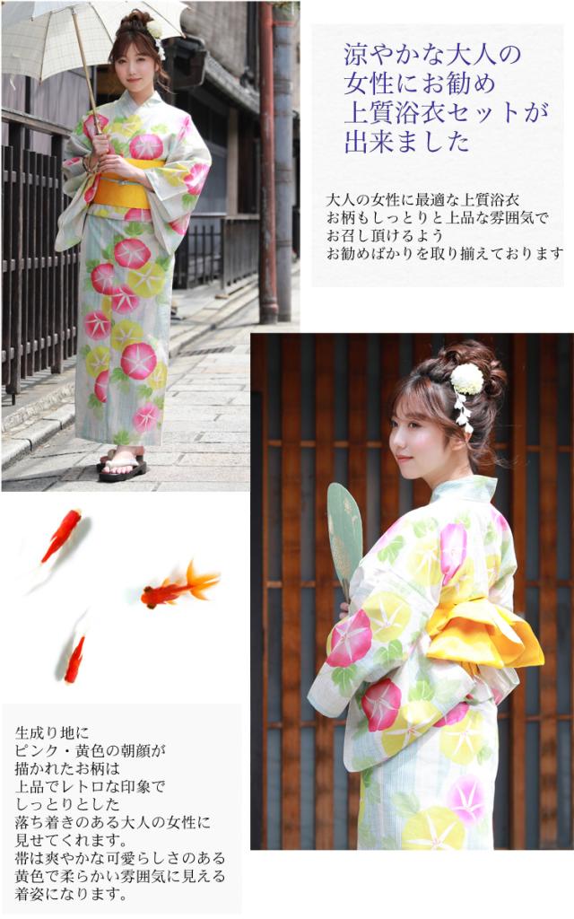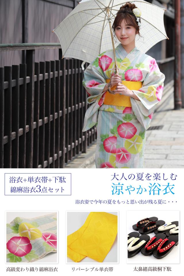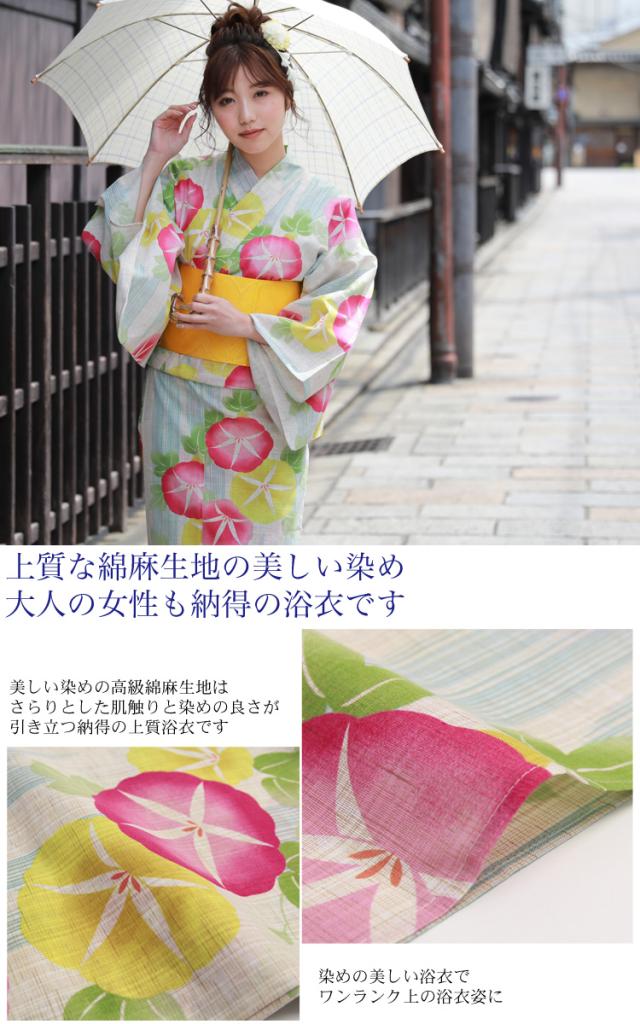 浴衣 セット レトロ 高級変わり織り綿麻浴衣3点セット「生成り地にピンク・黄色の朝顔」浴衣 生成り 朝顔 浴衣帯 黄色 レディース 古典柄 大人 キュート しっとり 2021