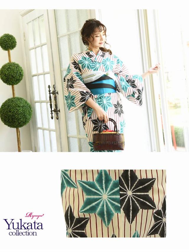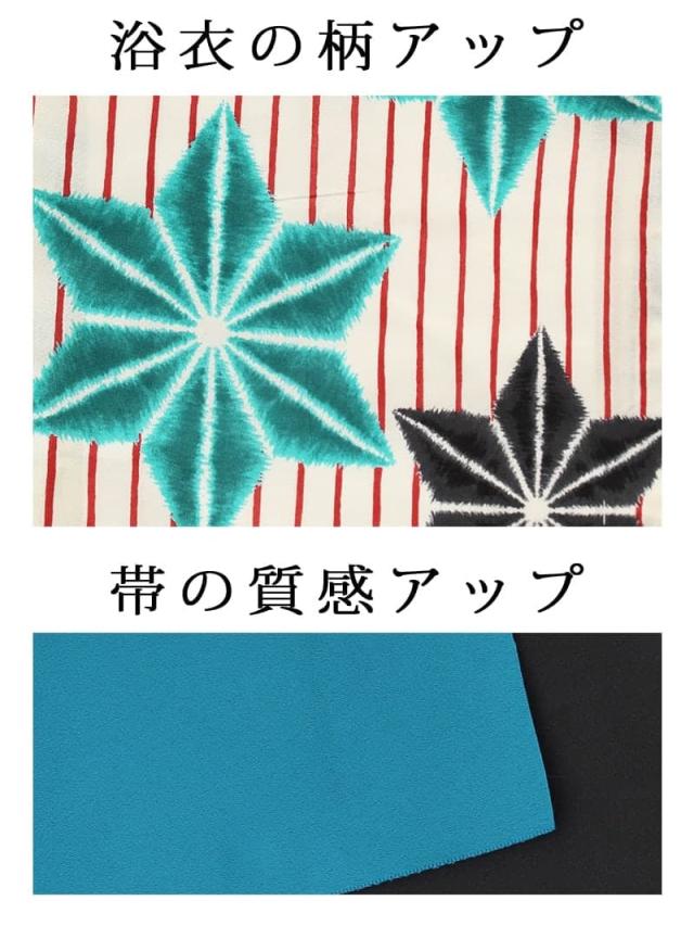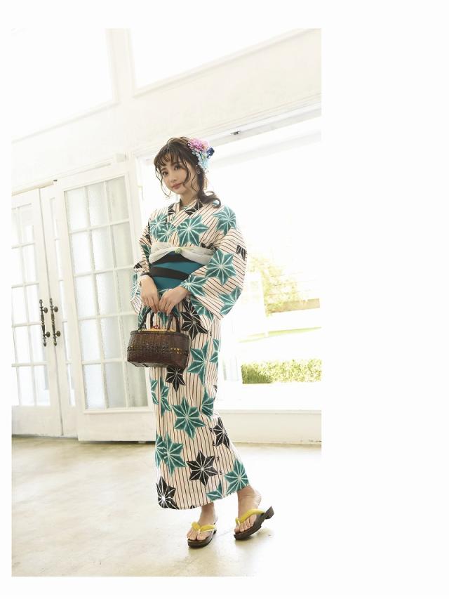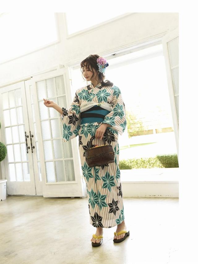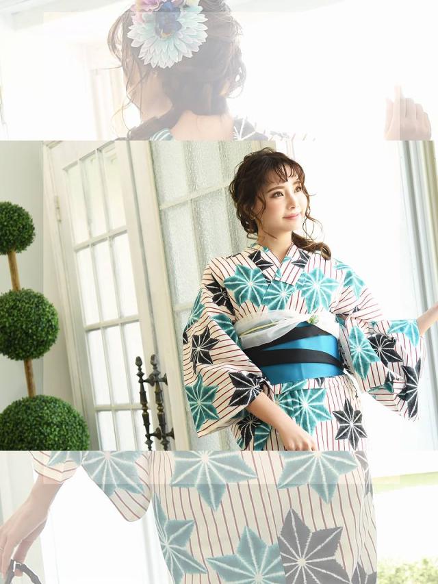 ☆モダンな麻の葉柄に白地浴衣は鮮やかな色合のストライプ柄がかわいいレトロモダンゆかた♪